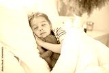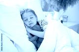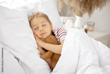 Sweet blond preschool child with teddy bear, lying in bed sick,