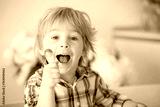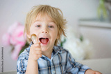 Little toddler child, blond boy, licking lollipop while watching movie on tablet