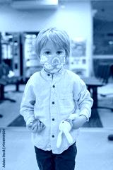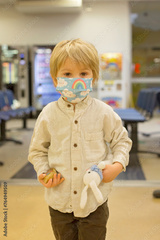 Child, boy, sitting in the waiting room in emergency, waiting for examination