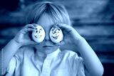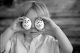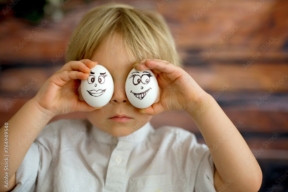 Cute child, holding white eggs with emotions drawn on them, funny faces