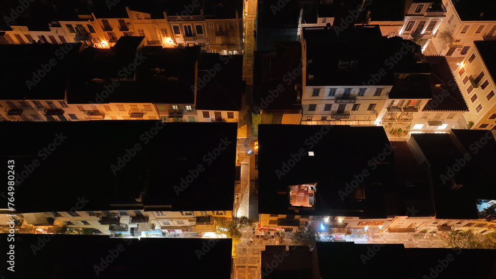 Aerial drone night shot of illuminated historic old city of Nafplio former capital of Greece, Argolida, Peloponnese