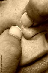 detail of two fingers during the removal of a black spot from a face of a person