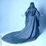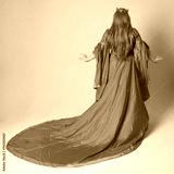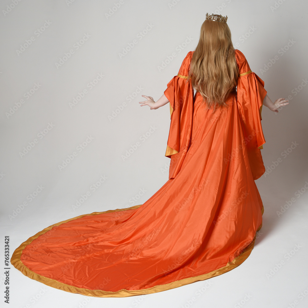Full length portrait of plus sized woman blonde hair, wearing historical medieval fantasy gown, golden crown of royal queen. Standing pose, walking away in silhouette, isolated studio background.