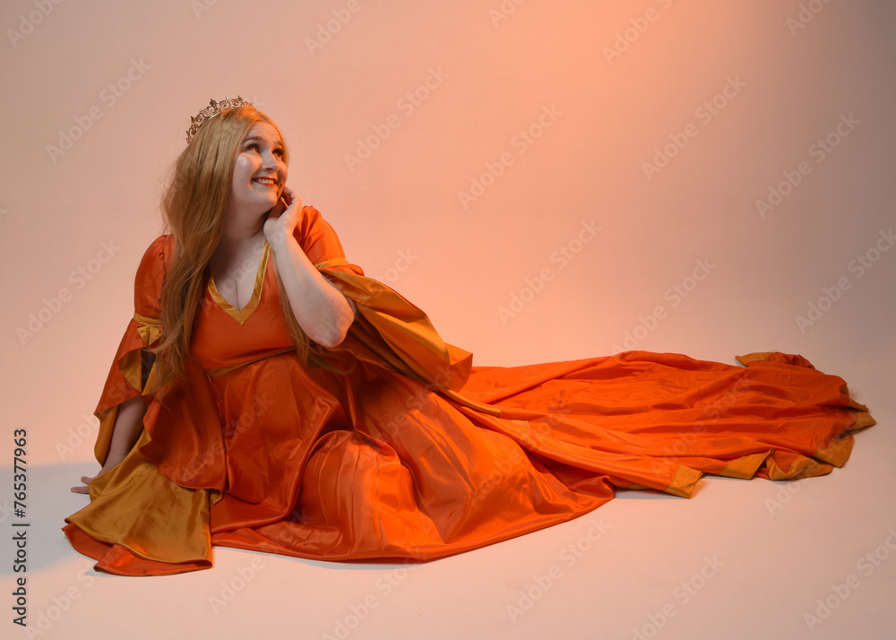 Full length portrait of plus size blonde woman, wearing historical medieval fantasy gown, golden crown royal queen. sitting pose isolated studio background.
