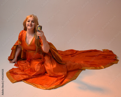 Full length portrait of plus size blonde woman, wearing historical medieval fantasy gown, golden crown royal queen. sitting pose isolated studio background.