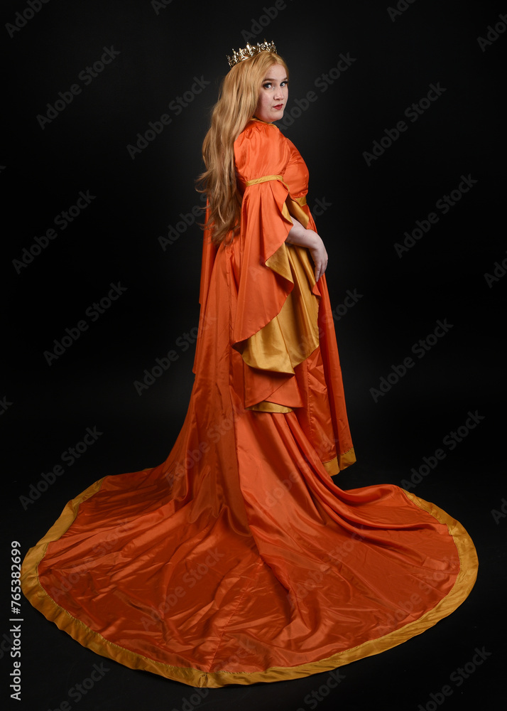 Full length portrait of plus sized woman blonde hair, wearing historical medieval fantasy gown, golden crown of royal queen. Standing pose, walking away in silhouette, isolated dark studio background.