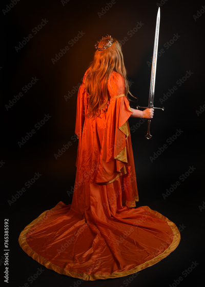 Full length portrait of plus size blonde woman wearing historical medieval fantasy gown, crowned royal queen. Standing pose backview, holding sword weapon, isolated dark studio background silhouette