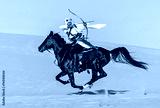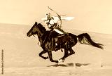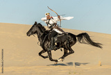 Arabian horseback archer riding his stallion and aiming at targets with his bow and arrow