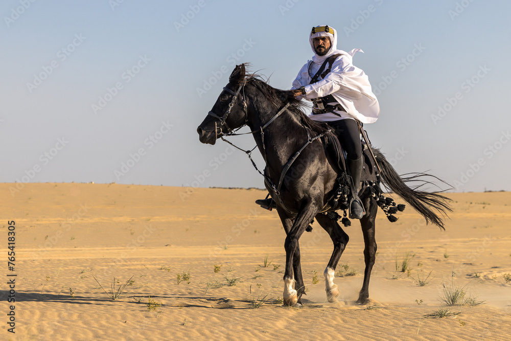 Arabian horseback archer riding his stallion in the middle of sand dunes