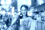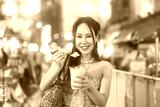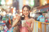 Happy asian tourist woman eating thai tasty dessert at China town asia street food market Bangkok, Thailand
