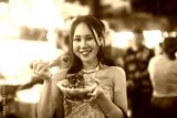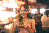Asian foodie tourist woman eating spicy grilled squid at China town asia street food night market