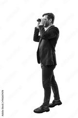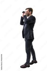 A man in a business suit looking through binoculars, isolated on a white background, concept of search and discovery