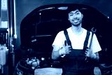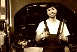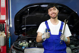 mechanic thumbs up pose and holding wrench for fixing a car in automobile repair shop