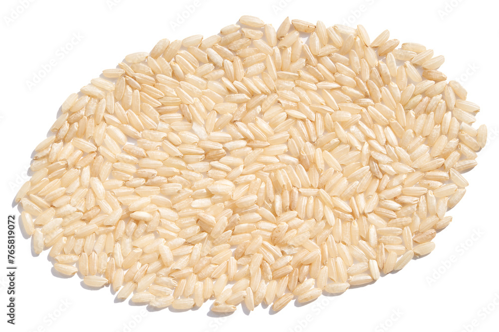 An oval of raw brown and white rice, forming a pile on an isolated background. The texture and pattern of long grains showcase Asian cuisine, emphasizing healthy, organic nutrition.