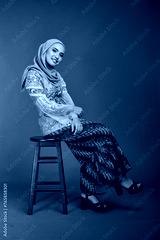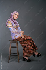 Beautiful female model wearing modern batik kebaya, sitting on a chair isolated over grey background. Eidul fitri festival fashion and beauty concept.