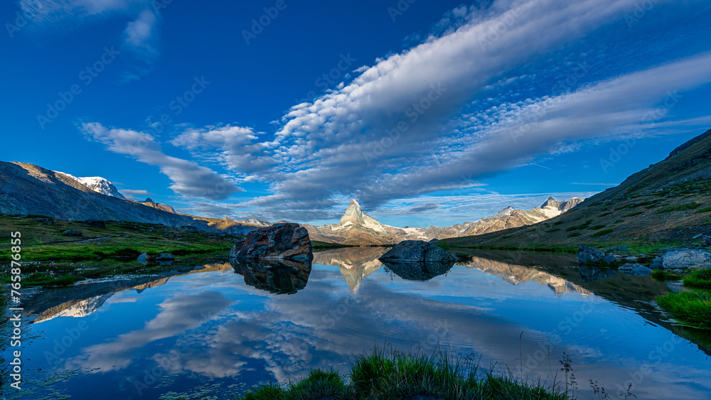 The Matterhorn reflected in Stellisee lake in the Swiss Alps