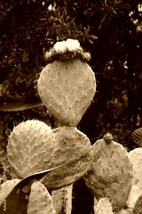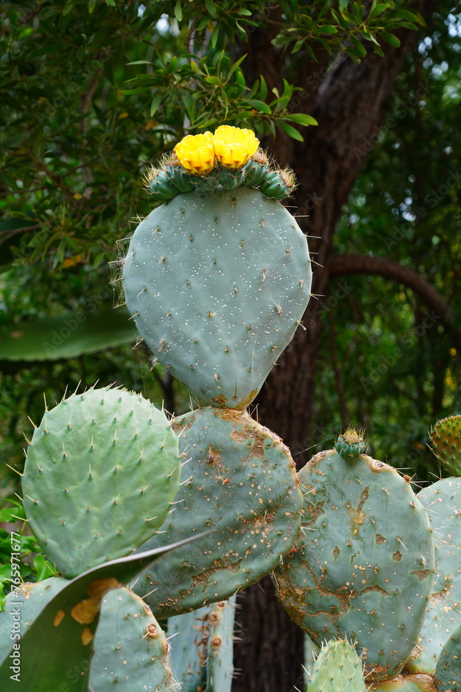 Red and yellow fruit of the prickly pear nopales cactus (opuntia) growing in Provence, France