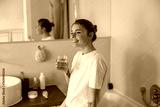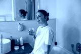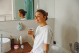Smiling young woman drinking glass of water in the bathroom. Morning beauty routine