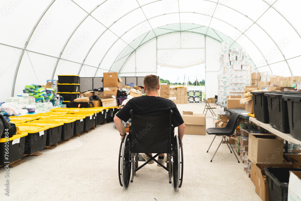 A veteran disabled man in a wheelchair helps in a humanitarian unit. Support of war victims.