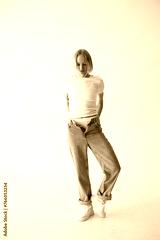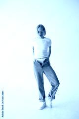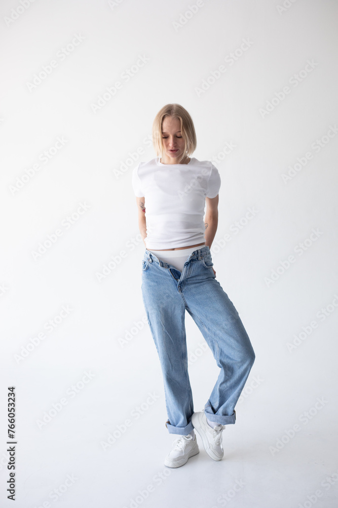Beautiful blonde girl in a white T-shirt and blue jeans and sneakers posing on a white background