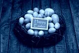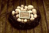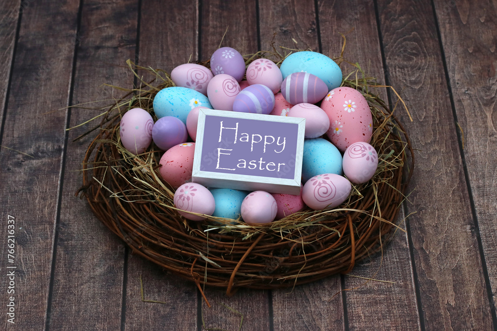 Nest with colorful Easter eggs and label labeled Happy Easter.