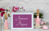 Carte de vœux Joyeuses Pâques : œufs de Pâques et lapin décoratif avec vœux de Pâques.