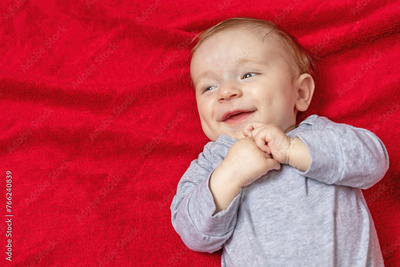 Top view of laughing baby boy lying on red blanket. The child looks at the free space ready for your use.