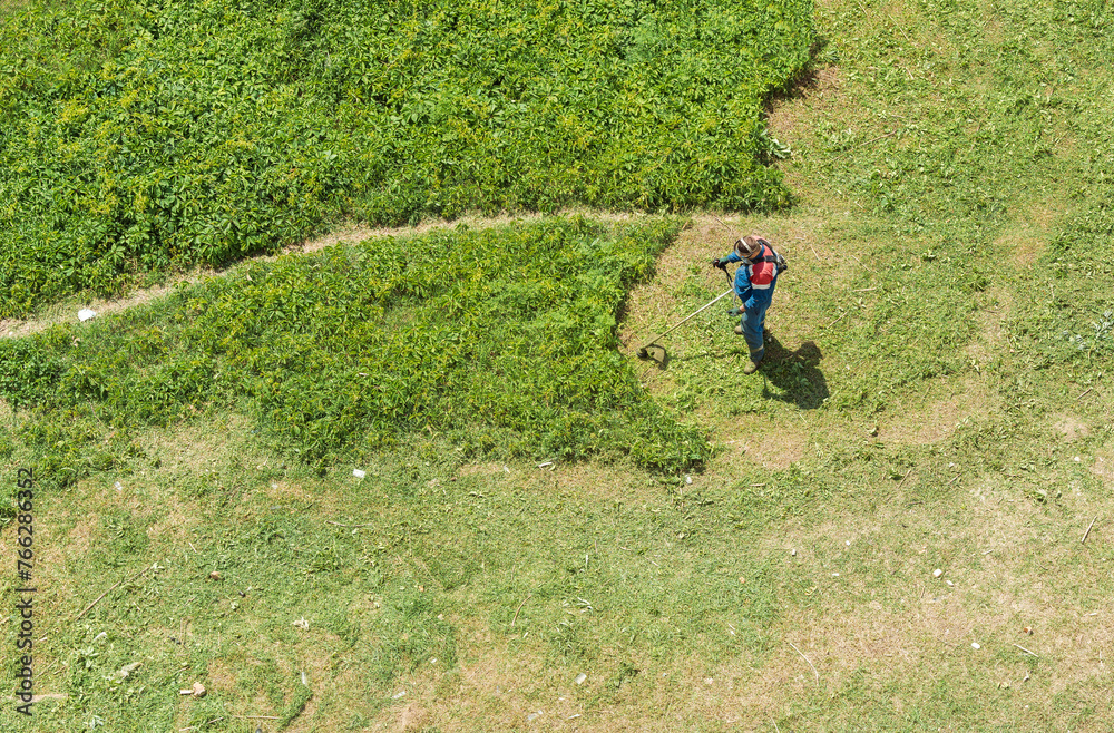 Grass cutting. Aerial view of man using lawn mower to cut overgrown grass in an urban environment. Scattered debris peeks through amongst the cut grass.
