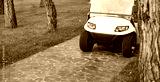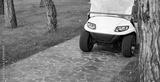 Picturesque background with fragment of golf cart for guest transportation and luggage around the hotel area