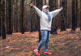 Smiling senior woman with open arms walking in mountain forest on a foggy day with the help of poles enjoying nature, freedom and free time. Forest background with bare trees