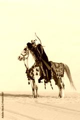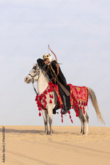 Saudi Man with his white stallion in a desert, shooting an arrow