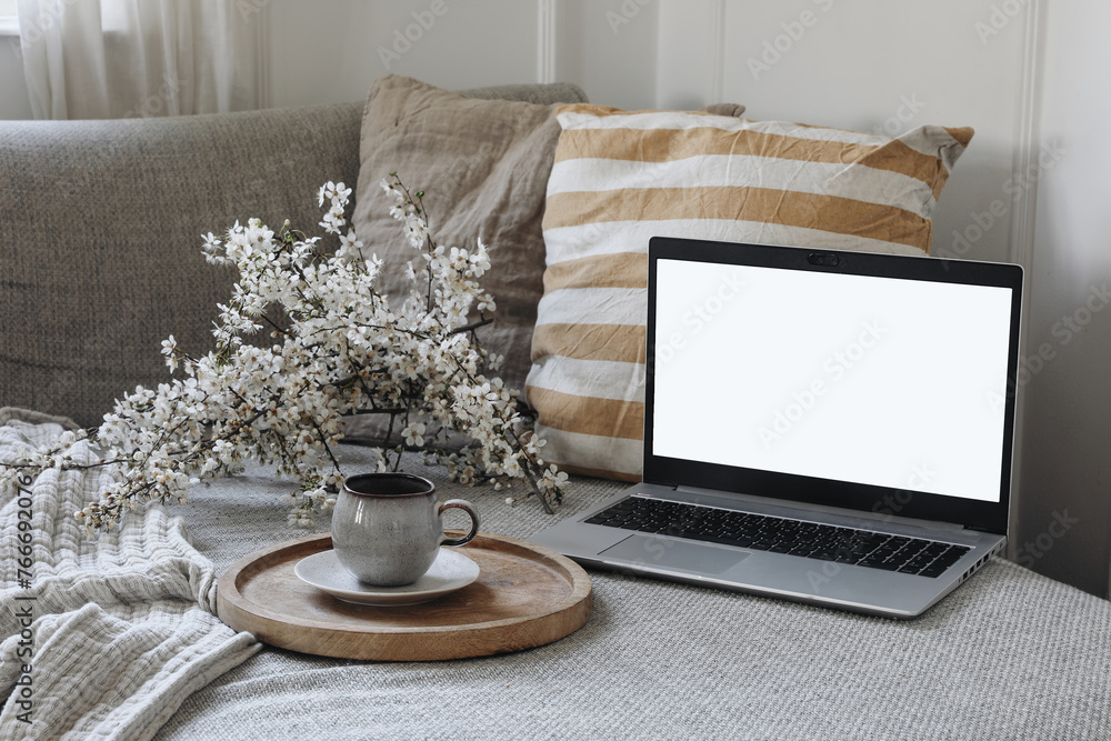 Modern spring scandinavian living room interior. Sofa with linen yellow striped cushions and cup of coffee. Cherry plum blossoms in vase. Laptop mockup with blank screen. Elegant home office decor.