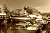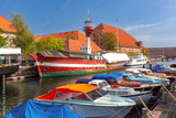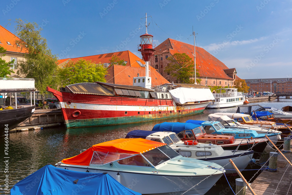 Old houses and ships in Old Town of Copenhagen, Denmark.