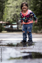 A young girl is standing in a puddle of water, wearing a blue and pink jacket