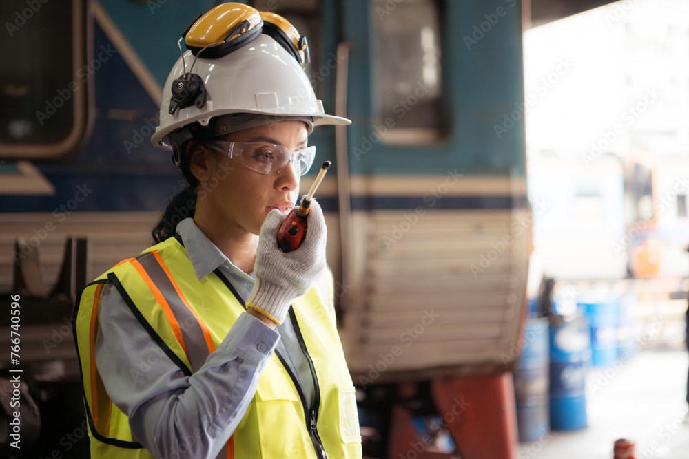 Portrait of railway technician worker in safety vest and helmet working and using a walkie talkie at train repair station