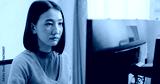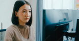 Young adult Asia female freelance typing write prompt AI bot IT app smart program nomad, video game, terminal with coding language, user interface, designer, big data center on desktop computer.