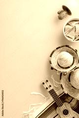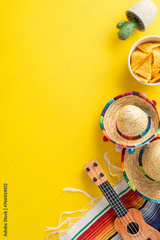 Cinco de Mayo festive arrangement. Vertical top view glance at iconic items: decorative sombreros, musical vihuela, cactus plant, serape blanket, placed on a yellow field, space for annotations