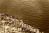 Sea side with calm and reflective water and many hard rocks on the beach side