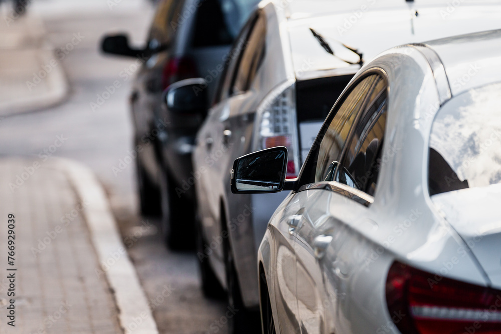 Parked cars next to a street close up on car mirrors