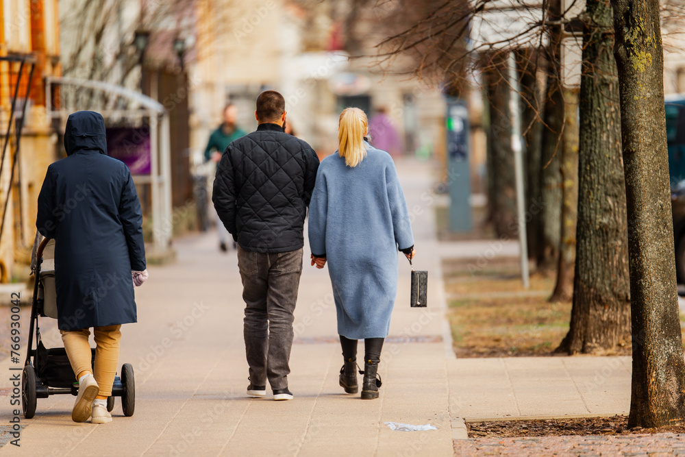 Lovely man and woman couple holding hands in love, going for a walk in city