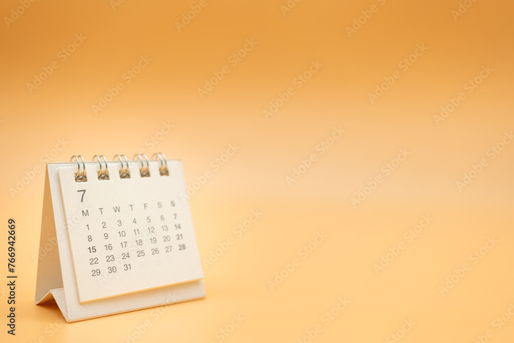 Desk calendar for JULY with no year isolated on orange background. Calendar concept with copy space. Desktop Calendar for Planner and management.