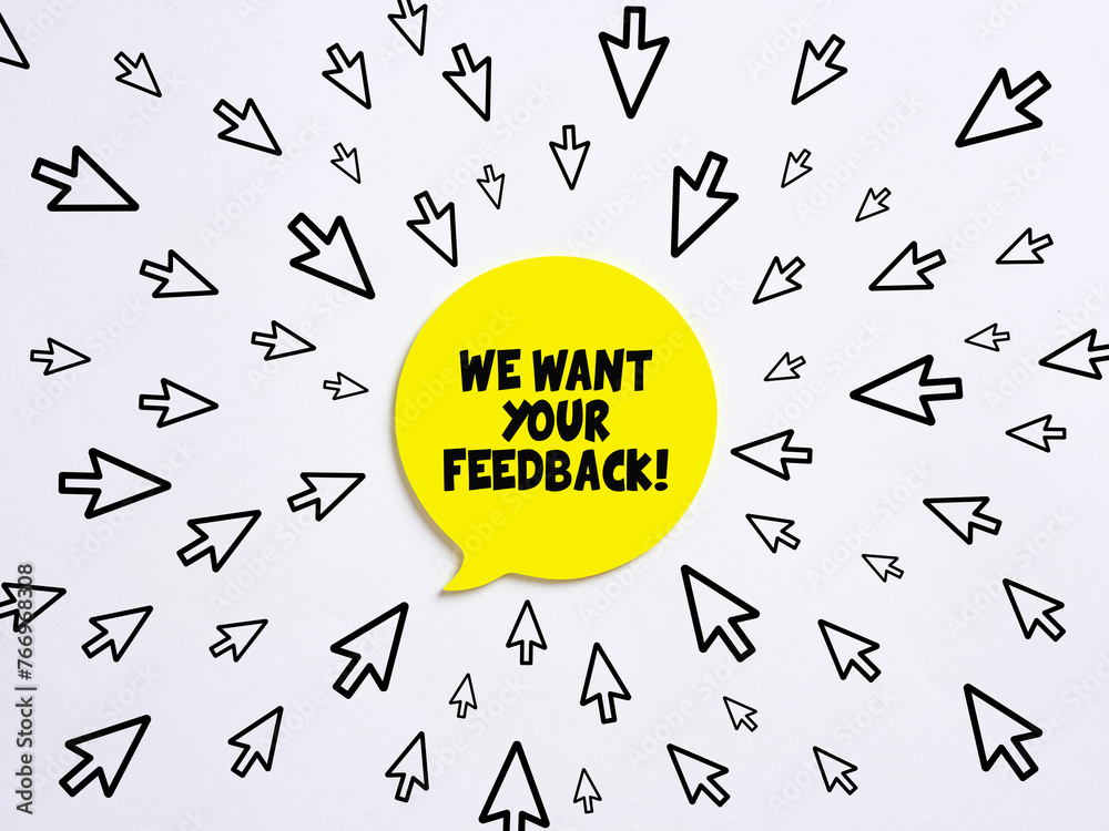 Speech bubble with the message we want your feedback. Customer service, support and evaluation concept.