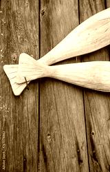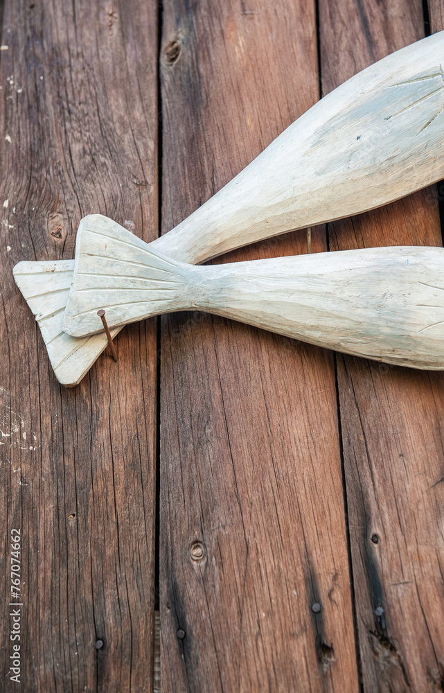 Carved wooden fishes tails on the old boards