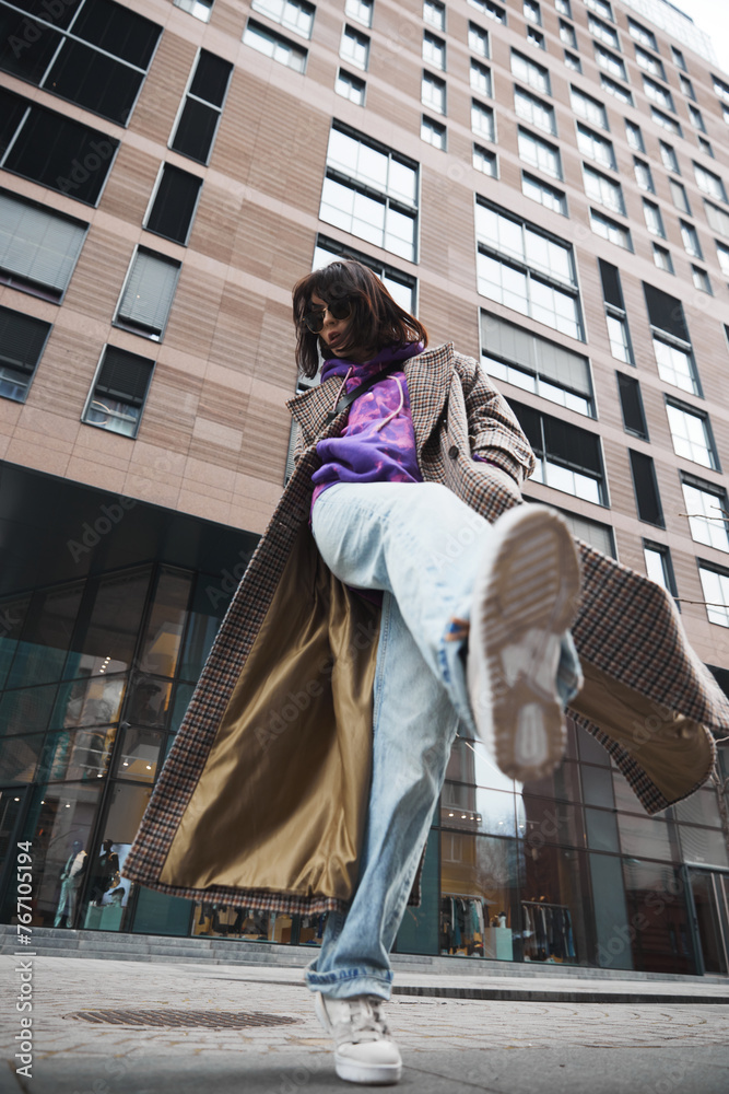 Comfort and style. Creative street photography with young woman in stylish casual clothes, coat, jeans and hoodies posing against urban architecture. Concept of street style fashion, beauty, trends