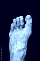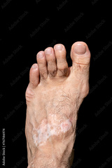 The man’s leg with skin condition that causes loss of melanin posing indoors. The foot model in black tank top suffering from vitiligo disorder.