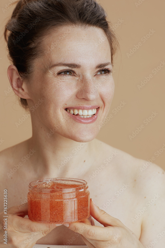 happy young woman with face scrub against beige background