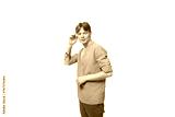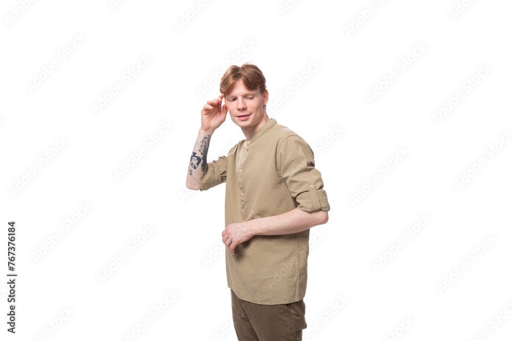 young well-groomed caucasian man with red hair is dressed in a khaki shirt and brown trousers on a white background