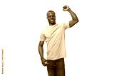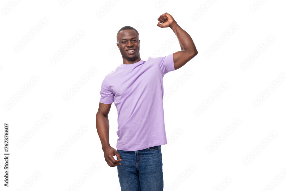 young charming african man dressed in a lilac t-shirt and jeans on a white background