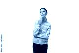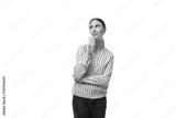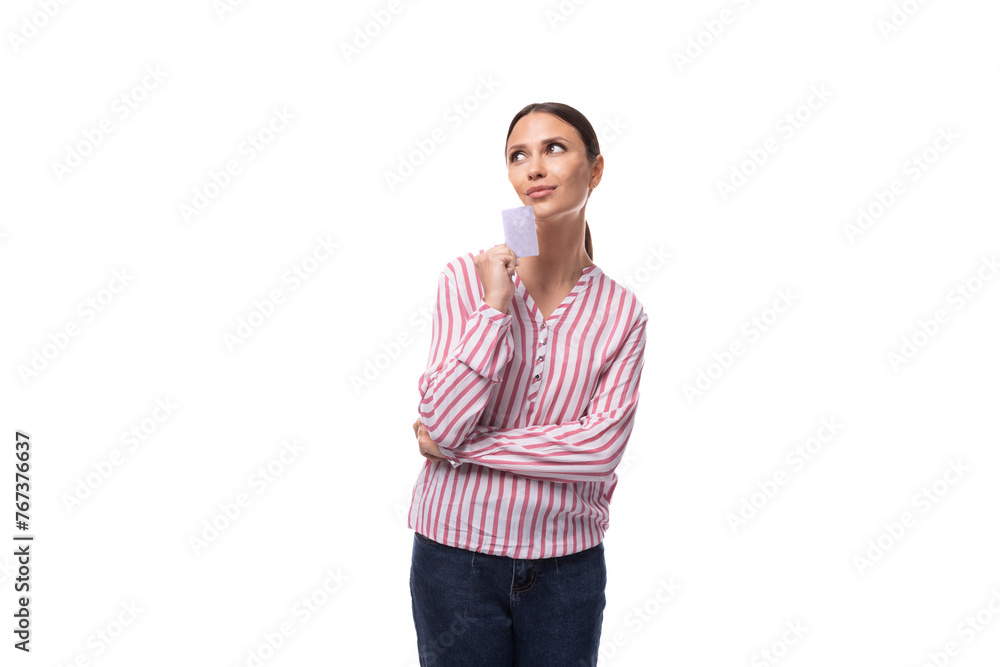 young brunette secretary woman with a ponytail hairstyle dressed in a striped blouse holds a credit card with a mockup on a white background