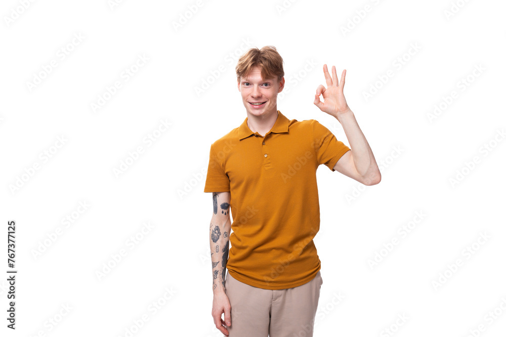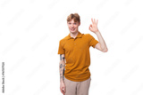 young stylish red-haired man with a haircut and a tattoo on his arm is dressed in a yellow t-shirt